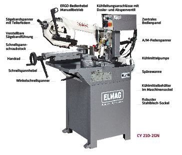 Einfache Gehrungsbandsägen sind mit einem drehbaren Sägebandrahmen und einem fest montierten Schraubstock ausgestattet. Sie ermöglichen die Fertigung von einseitigen Gehrungen (z.B. CY 210/260).